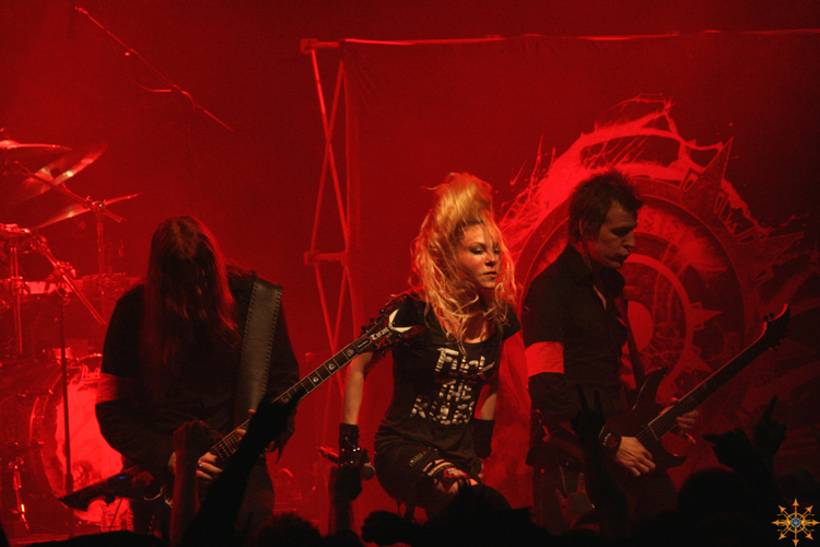 "Revolution Begins" was next; its signature opening notes immediately drew a response from the fans. I personally love this song off of "Rise of the Tyrant", which is their latest release of all new material. I thought it was one of the best songs of their entire set. It has a slightly slower pace in terms of drum and guitar assault and this gives Angela a chance to shine even stronger. This song is a great anthem with a powerful motivational statement lyrically, as well as awesome driving music.