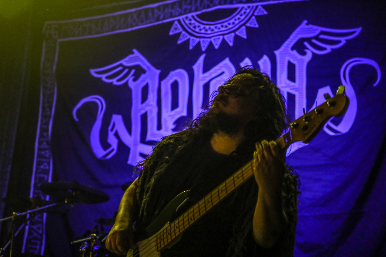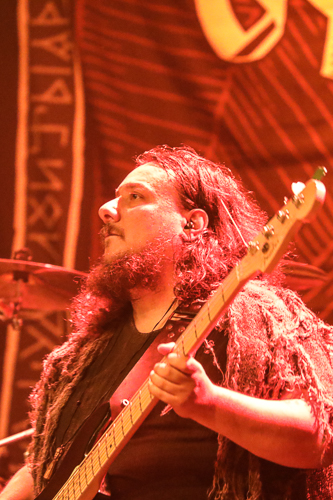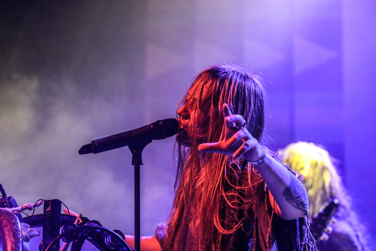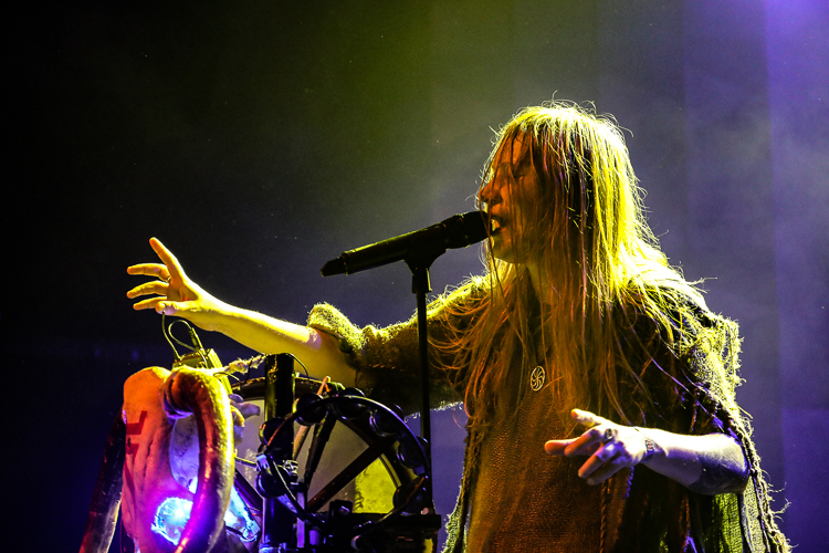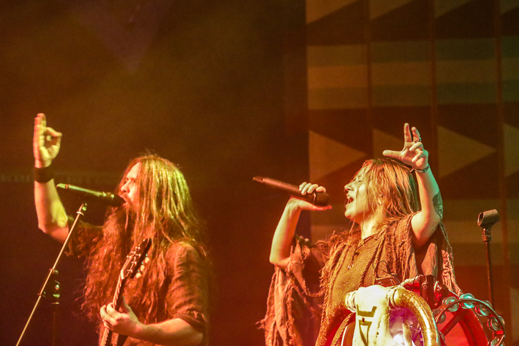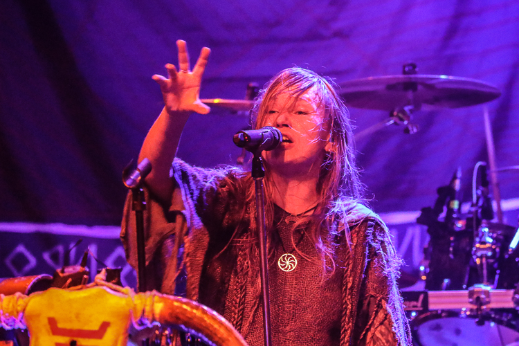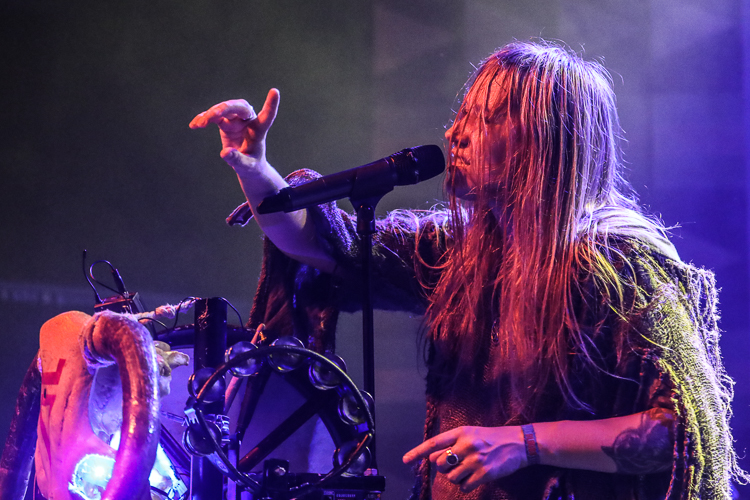 Arkona Live at The Regent Theatre Downtown Los Angeles, CA November 18th, 2018 Review and photos by Travis Baumann Arkona have been cited as one of the best Pagan Metal acts in the world. Exemplifying the mixture of folk instruments with the trappings of the heavy metal world and infusing it with the mythos of ancient folk lore and a shamanistic approach to verse and vocalization, Arkona have become an international phenomena. At the heart of the band is the mastermind Maria "Masha Scream" Arkhipova, vocalist and chief songwriter. Her signature voice moving from melodic and soothing to the searing screams of battle and back again is one of the primary draws to the band. Backing her up is a score of musicians including Sergei "Lazar" Atrashkevich on guitar, Ruslan "Kniaz" Rosomaherov on bass guitar, Vladimir "Volk" Reshetnikov handling all of the wind instruments such as lutes and bagpipes, and Andrey Ishchenko on drums. Their combined instrumentation ranges from raging metal head-bangers, to plucky polka-infused jigs, to intense melodic folk ballads that are heart-felt and uplifting. The band formed in Moscow, Russia back in 2002 and have a sizable catalog of albums to draw from. Their latest release, "Khram" came out earlier this year and this tour was the first opportunity to see this material live. They started off the set with a presentation from "Khram" that followed the album order and allowed them to tell the story as it was conceived. It began with the "Mantra" intro and then moved through "Shtorm" (Storm), "Tseluya zhizn" (Kissing Life), the album title track "Khram" (Temple), "V pogonye za beloy tenyu" (In Pursuit of a White Shadow), and concluded with a reprise of "Mantra" as an outro. It was really great to see the new material in this manner, and lent a sense of a complete story before moving into their older fan-favorites. From here they really got the mosh pit moving with "Goi, Rode, Goi!" which translates to "Hail, Rod, Hail!", Rod being the supreme god of the universe in the native Slavic faith. They hit upon my personal favorite song, "Zakliatie" from the "Slovo" album which means "Incantation". Masha made gestures with her hands in the air as she chanted, weaving a shaman's spell on stage. They played two more off of the "Goi, Rode, Goi!" album with "Kupalets", referring to the gods of Slavic folklore, and the band's namesake, "Arkona". The majority of the set not taken from "Khram" came from this album with two tracks from "Slovo" and only one older song. The oldest piece that they played for us on this evening came from the album "Vo Slavu Velikim!" and was "Skvoz Tuman Vekov (Through the Mist of Ages)". Masha does not speak that much between songs other than to offer thanks for the warm response of the audience. She said they had two more this evening and motioned with her hand for the circle pit to go for it on this next one. "Stenka na stenku" means "Wall to Wall" and features a rowdy accordian/polka tempo which brought out a jovial yet violent response from those in the mosh pit. They hit their final song of the evening with "Yarilo" which is the Slavic deity of vegetation, fertility, and the spring season. Setting the final tone of the evening with one of uplifting regeneration was a great way to hand the show over to tour-mates Korpiklaani. It was another amazing performance from Arkona showing they really are the pinnacle of pagan folk metal. Everything from their costuming choices, to the musicianship, and most of all their vocal and song structures, conjures the essence of this genre and what draws people to it. Despite her singing entirely in Russian, people sang along and were pulled into the worlds and narrative that Masha wove which is always exciting to be a part of. I am already looking forward to the next time they tour as you can never get enough Arkona. |