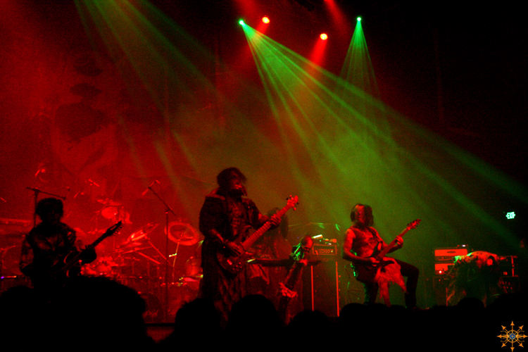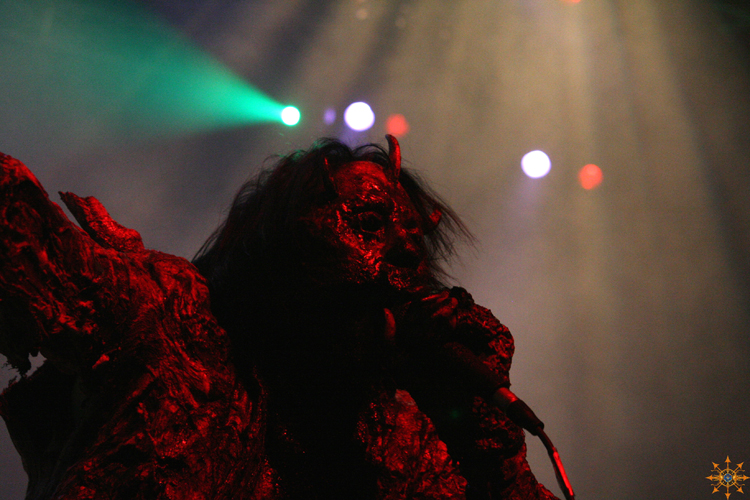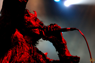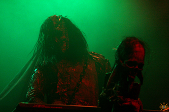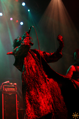 The band emerged fully adorned in prosthetic makeup that made each look like flesh-torn creatures or demons. They were also sporting odd clothing, resembling a butcher's dress if they worked in a slaugherhouse in hell.
