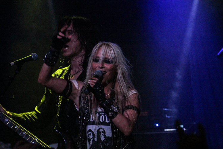 Doro Pesch The Voice of Warlock Live at the Whisky a Go Go West Hollywood, CA September 16th, 2017 Review and photos by Travis Baumann Prior to Doro Pesch, "The Reigning Queen of Metal", embarking on her prolific solo career, she was the voice of Warlock. The seminal German heavy metal band put out four albums back in the 1980's that placed them in the history books of the world heavy metal scene with many fans still listening to those albums to this day. 2017 marks the thirtieth anniversary of their final and best album, "Triumph and Agony". In honor of this anniversary, Doro has rejoined forces with guitarist Tommy Bolan for a limited-run North American tour, the final night being here in Los Angeles. The Whisky was packed to the rafters with fans ranging from very young to the opposite end of the spectrum. Portions of the audience had flown in from all over the country as well as Doro's homeland and neighboring Luxembourg as well. Keeping us all in suspense, Doro finally emerged to the roaring crowd. Her ultra blond hair standing out in the dim room like a firebrand. They started off the set with "Touch of Evil" reviving the three decade old material with fresh stage energy from the first song. Doro is very enthusiastic, a huge smile on her face for the entire performance. For the anniversary of "Triumph and Agony" they were going to do every song on the album but were mixing it up in order. "I Rule the Ruins" was up next followed by the crowd pleaser, "East Meets West". The audience was singing along to every verse and twice as loud on the chorus. Doro recognized some fans from Germany and Luxembourg in the front and she got quite excited, saying they had been with her since the beginning and their devotion meant the world to her. Continuing through the songs from the album "Three Minute Warning" was followed by "Kiss of Death". For the next song, one of the guitarists went to a keyboard on the left side of stage and the bassist went to a keyboard on the right side of the stage. The tandem keyboards set the tone for one of Warlock's most popular hits, "Für Immer". Doro moved around the stage, taking time to shake hands and fist bump all of her fans in the front while singing the emotional ballad. This song marked a good half way through the album and as it finished everyone left the stage except for Tommy Bolan who proceeded to shred out one insane guitar solo. It was pretty impressive to say the least. At points he seemed to be using a magnetized ring that lit up as he would just strum his hands in the air inches above the strings and create crazy musical moments laced in distortion and feedback. Doro and company rejoined Tommy for "Cold, Cold World". Doro introduced the next song as one they never played on stage for prior tours but it was an important song with a strong message, that being "Make Time for Love". "Metal Tango" coming on it's heels meant there was only one track left from this release, and it was by far their biggest hit of all Warlock songs. "All We Are" was well known in Europe and the US, it received high rotation back in the day via "Head Bangers's Ball" and MTV, and was definitely the high light of the show. Doro took the mic around the venue and had fans join her in singing the iconic chorus. With the album complete, Doro began taking requests from the audience, directing suggestions back to older Warlock material as opposed to her own solo material. They played a number of songs including "Earthshaker Rock", "Burning Witches" and a cover of Skyline's "We Are the Metalheads" to finish out the night. It was great seeing Doro on stage once more and while she has included the occasional Warlock song in the shows devoted to her solo material, it was really cool to experience her performing solely Warlock material and with Tommy Bolan joining her for this occasion. |