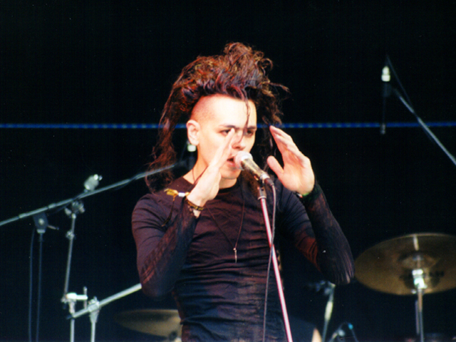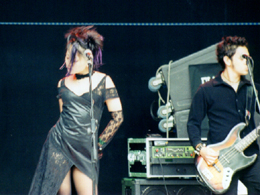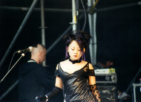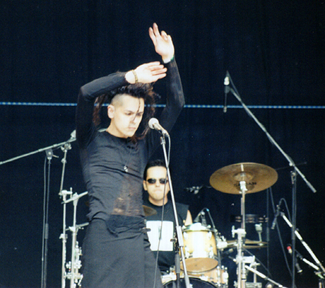 review by Travis Baumann Elegia was initially supposed to go on between Cryptic Carnage and Janus but after a bit of delay Janus took the stage (see review - they were awesome). We thought at first maybe Elegia would just cancel but they came on after. Elegia had a number of flyers circulating the festival which stated this was their first appearance outside of Japan. An audience member we were talking to said they were mostly from Brazil with one or two Japanese members. Their stage presence was very much a gothic appearance with their hair done up similar to a Robert Smith type thing but a bit more dreadlocky in appearance. The lead vocalist was a tall slender guy in black body-suit type material. Accompanying him was a drummer, guitarist, and a female back-up vocalist. Overall they were ok but I found them a little slow especially coming down after the fantastic experience of seeing Janus live. I think they have a kind of cool look but a dark shadowy club would do them more justice than bright sunshine. The female vocalist seemed to be more there for show and presence as her parts were usually one word verses more said than sang but she did add a nice bit of ambiance and extra vocal power on the chorus. |