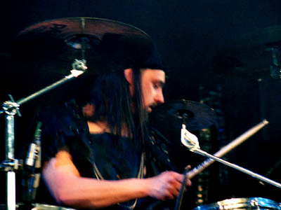 Both he and the keyboard/piper woman wore long medieval style robes of different shades of blue. Way in the back, a drummer sat behind his kit, banging out the beats, hard to make out but also dressed in leather garb.