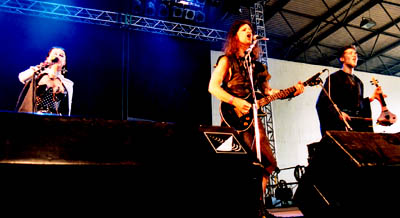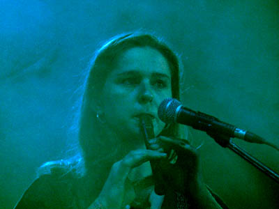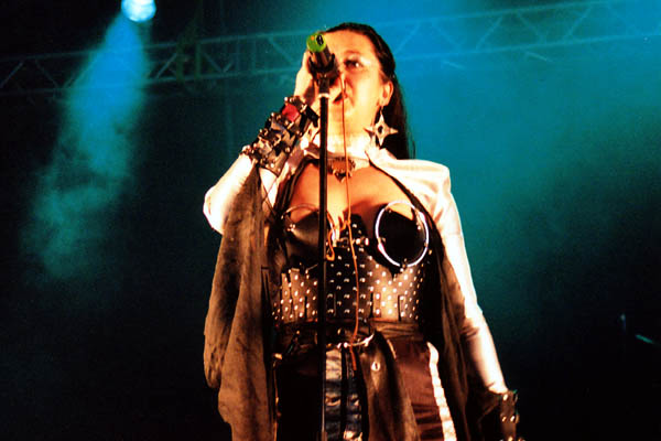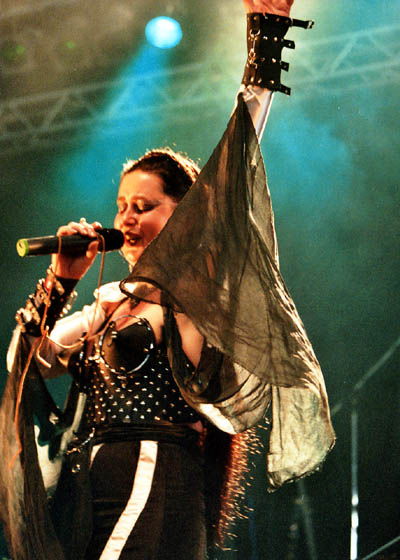 The band consisted of first off, a female vocalist wearing a unique corset type outfit that had large metal cones for her brazier, sort of like the operatic female Viking outfits of the Valkries from Vagner or something. She spun around with her veils and was very active and exuberant.