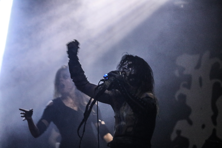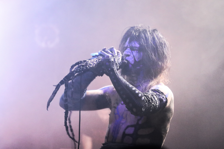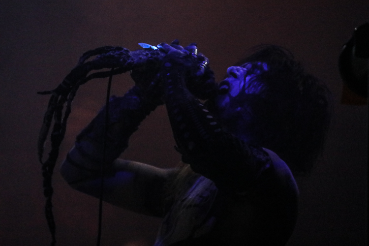 Igorrr Live at the Echoplex Los Angeles, CA February 12th, 2018 Review and photos by Travis Baumann Igorrr is the alter ego of French composer Gautier Serre. The music he makes is truly genre-spanning and impossible to classify as it is as much Aphex Twin as it is Mayhem. Baroque classical influences blend together with operatic vocals, death metal growls, Diamanda Galas style screeches, heavy doses of breakcore and chugging metal guitar. Songs are intense, the performances emotional and moving. Live on stage he is joined by dual vocalists Laurent Lunoir and Laure Le Prunenec as well as percussionist Sylvain Bouvier. Laure gives gripping delivery of clean operatic vocals punctuated by emotional outbursts of tragedy and anger. I cannot really understand the lyrics but the emotional impact is more important than exact wordage. Laurent is painted in unique body and face makeup that has contrasting shades and vein like designs that work extremely well in the dramatic lighting and smoky atmosphere. In addition, he holds a customized microphone that looks alien-like, similar to a portion of a crustacean with blue lights inside of it that shine on his painted face as he sings in growls and screeches. I discovered Igorrr several months ago as their latest release, "Savage Sinusoid" was released on Metalblade records this last year. I applaud Metalblade for taking risks and signing bands that reach out from the standard metal genre fare as Igorrr are definitely not normal by any means. The crowd at the Echoplex reflected the mixed nature of the music as well. There were a few metalheads present but there were also ravers, electroheads, avant guardians, and the obligatory hipsters. Regardless, the entire crowd got into the show and were moving around in their own fashion. Some people had their fists in the air, others were pogo-sticking to the beat and at several points, a mosh pit broke out up front. I have not been into Igorrr long enough to recognize many of their songs but they played a lengthy set, around seventeen songs, ranging from material from the newer release which features a good number of heavy guitar segments in addition to some of the more operatic/baroque elements from previous releases such as "Tout petit moineau" from "Hallelujah". It was a pretty cool experience and I definitely enjoyed the show. I think Igorrr provide something unique which is harder and harder in the ever expanding world of music. At times they are headbangers, others abrasive experimentalists, and underlying it all is a strong, moving electronic essence that brings to mind the earliest pioneers of industrial music. I guess you could say Igorrr personify this mentality the strongest despite their sound not falling into what most consider industrial music, especially by today's standards. They have quite a bit in common with mind set that drove bands such as Throbbing Gristle, Foetus, Skinny Puppy, and Diamanda Galas to create the genre defying music that they did, and it is good to see artists still inspired to break the molds and redefine genres. I highly recommend checking them out, if nothing else to see how well these elements actually blend together and form a very intense listening experience. This was their North American live debut, hopefully they return as their live show exceeds expectations. |