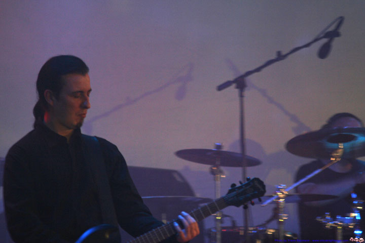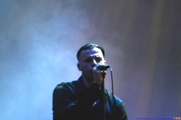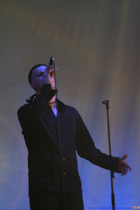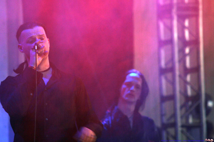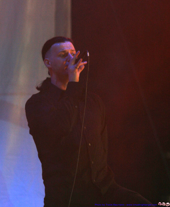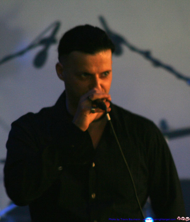 | We walked in late on Scream Silence and missed our chance at the photo pit but I did snap these few shots from way at the back (yeah Canon!). We have listened to these guys for over three or four albums and enjoy their dark romantic sound. They remind me of a more melancholy Dreadful Shadows or Wolfsheim whom they cover excellently on "Sparrows and Nightingales". They do have their own sound, don't get me wrong but they are somewhere in between the two in terms of beat and mood. The songs we heard live were good, definitely a great live act and capable of a moving performance. |