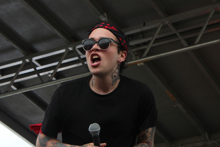 While some of the Metalcore performers of the day have a near hipster appearance, these guys had a darker image, mostly in black with red pieces of cloth tied around their right arms. Their banner in the back drop was a red field with large scissors on it.