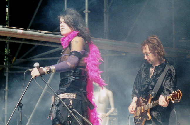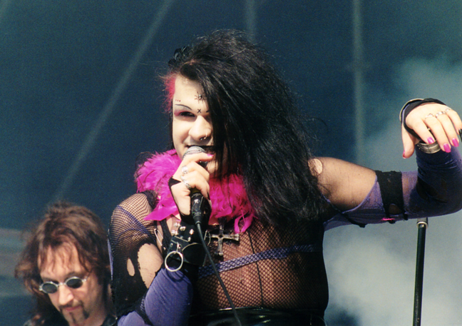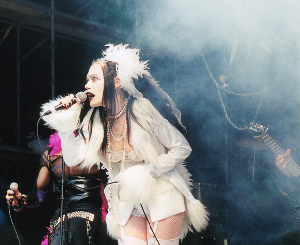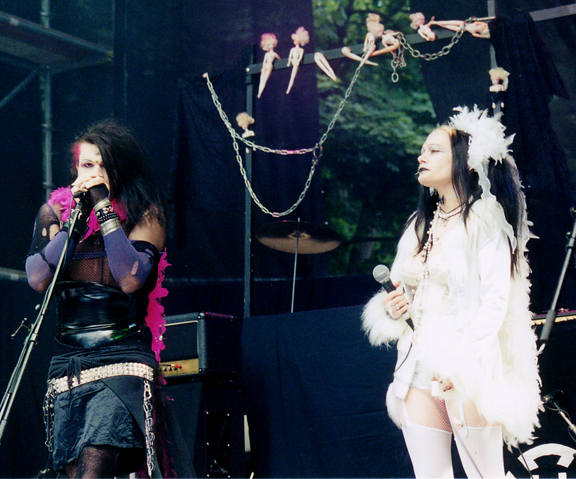 review by the Virtual Night Angel The Wave-Gotik-Treffen Festival was held from June 1 - 4, 2001. Sanguis et Cinis played live June 3, 2001 at Parkbühne in Leipzig, Germany. Sanguis et Cinis consists of: Eve Evangel and Celine Cecilia Angel. Adore Asherah and Wayne Deleon are additional members. Sanguis et Cinis were one of the main reasons why we chose the Wave-Gotik-Treffen Festival over the other great festivals held in Germany. Someday we will attend the M'era Luna, Wood Stage, Euro Rock Fest, Zillo Festival and all the other great festivals. We really respect In-Move who put on Doomsday 2000 and feel they are great promoters. We heard the Wave-Gotik-Treffen was the best of all the festivals and the line-up completely blew our mind! This time I decided I would photograph the bands, as well. I was nervous before seeing Sanguis et Cinis for the first time. I was standing in the photo pit waiting for the introduction to start. What if they think my camera is a dinky piece of shit? What if they get pissed that I keep zooming in on them to snap as many quality shots as I possibly can? What if Eve Evangel throws something dangerous at me? We were allowed to take pictures for three songs. Eve Evangel appeared in many ways flashy, flamboyant and bratty with his opening statement, "We're a fucking rock band". Eve Evangel acted like he's been in the scene for a long time, which he has. He had a tremendous level of confidence. During those first few moments I got a Groovie Mann / My Life With The Thrill Kill Kult vibe. It was a good thing and the small similarities were amusing. Eve and Celine were full-blown on stage right before me and it was truly amazing. It was intimidating for me. They are really cool close-up. I could definitely feel an aura about them both. The outfits, make-up, nails, jewelry and head dressings were all really special. There was a huge line formed outside for people waiting to see Sanguis et Cinis and enter the Parkbühne stage area. There were so many completely entertained fans. You'd have to be crazy to take your eyes off this band. These are two very beautiful people and extremely talented. Eve has been making music since at least 1989. He started providing Sanguis et Cinis music to the public in 1995. It was a very enchanting experience seeing them live. The live voices of Eve Evangel and Celine are so unique and have such an impressionable effect. It is a different sound that they have combined and created together. Sanguis et Cinis' sound as good as they look! Their attitude is very dominant mixed with their intense fashion, gothic make-up and very striking appearance. Eve Evangel, the male lead singer and lyricist had an X on his head, wore a skirt, a pink fluffy boa that matched his magenta side streak in his hair and his pink nails. Eve Evangel is so beautiful, handsome, bold, masculine, fearless and dresses in an appealing way. On bass, Adore wore his new purple SeC jersey shirt from one of the Sanguis et Cinis fan clubs and later bared his chest with some very unattractive writing. The guitarist, Wayne proved to be an experienced musician. Eve's voice is a wide range of preferred styles. Eve sometimes uses old punk reminiscent elements to the music. Eve Evangel is a great singer and composer. At times Eve Evangel reminds me of an old favorite, Danzig. Eve doesn't need distortion, although he does use it well when he chooses to. Celine Cecilia Angel's voice can get very high pitched at times, but not off key. Celine Cecilia Angel's voice is exceptional and she sings so peacefully. The more I listen to their CD, "Madrigal" the more I like it. "Amnesia" is still my all time favorite CD. I've bought it again after I lost the first copy. The "Schattentanz" Compilation featured the song, "Personenkult" by Sanguis et Cinis and it is an awesome introduction to the band and different from the CD version. I wasn't sure if Celine Cecilia Angel & Eve Evangel were together as a couple or not. They didn't flirt during the show. I did want them to interact more at times but they were really focusing on their sound, showing fans how musically inclined they are live. Eve Evangel and Celine Cecilia Angel are married. I think Eve and Celine Cecilia Angel are gorgeous and a match that was meant to be made. I've always gotten a "they're perfect for each other feel". I get a romantic feel from the band. I was not surprised that some individuals at the festival tried to look as adorable and unique as sweet, skinny, pixy, Celine Cecilia Angel and dressed in her signature attire. Perhaps SeC is too good for any one set style or genre title of music. They are really broad, multi-talented artists with extraordinary ideas that they have followed through with. I really think Sanguis et Cinis is part of a growing group of artists that continuously contribute to the scene. This band is not inaccessible. The whole set was just too short, only about forty-five minutes. We really enjoyed the experience and wanted it to go on so much longer. What will they do live next? Thanks to Eve Evangel and Cecilia Cecilia Angel for providing so many photos for everyone to enjoy in the CD's, on the internet, allowing people to take photos at the live venues and all the extra efforts you have made. -VNA Various Sanguis et Cinis informative web sites. http://www-user.tu-chemnitz.de/~jea/sanguis/ http://clubs.yahoo.com/clubs/sanguisetcinis (international/spanish) http://clubs.yahoo.com/clubs/sanguisetcinisx1986x (german) http://clubs.yahoo.com/clubs/sanguisetcinisusfanclub (english) |